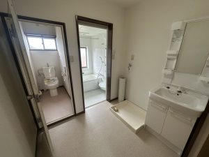 洗面脱衣室、洗面台、洗濯機置場、浴室(高温差し湯式)、シャワー、トイレ、温水洗浄便座