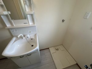 洗面脱衣室、洗面台、洗濯機置場、浴室、シャワー