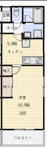 - 洋室10.5帖、TV、押入、エアコン、ベランダ、